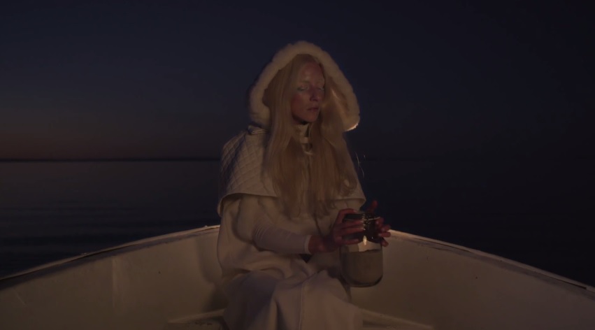 We’re left to assume that the box is burnt into the ash that she scatters from the boat shortly after that shot of the fire midway through the video, which leads us to our second repeated image from kin, dust. The mop monsters were a huge recurring image in kin and dust and dirt went hand in hand with them. Jonna was frequently covered in the dust, spoiling the white clothing she started out in (notice how the white outfits are also back?) Back in 2012 when I was watching and writing about these videos it wasn’t until I figured out what the mop monsters represented that I realized that this was what it was keeping her prisoner. But in this video the dust takes on a new, different meaning. Here she takes jar of dust/ash out into the ocean and scatters them like ashes at a funeral. That image I grabbed above of her lying in the boat reminds me also of Viking funerals, a ritual where the dead are placed into a boat, pushed out to sea and burned to ash. To me the obvious metaphor being expressed in “fountain” is that of the phoenix rising from the ashes. She’s taken the box that confined her all through kin, destroyed it, and is now reborn into a new version of herself. Like the fish that’s escaped its cage she’s finally free of her box. And now that she’s free I’m really excited to see what new directions this inspires her to take music in the future. Let’s hope there’s another 8+ videos waiting for us in 2014.